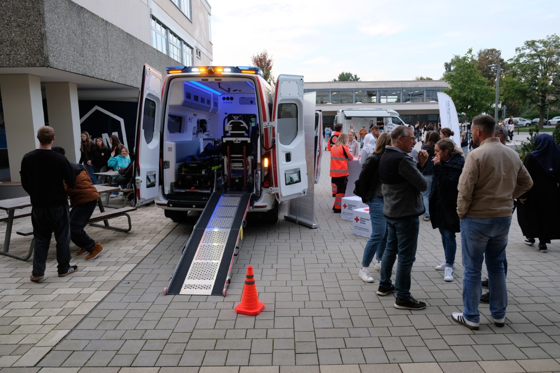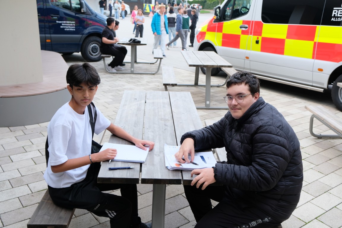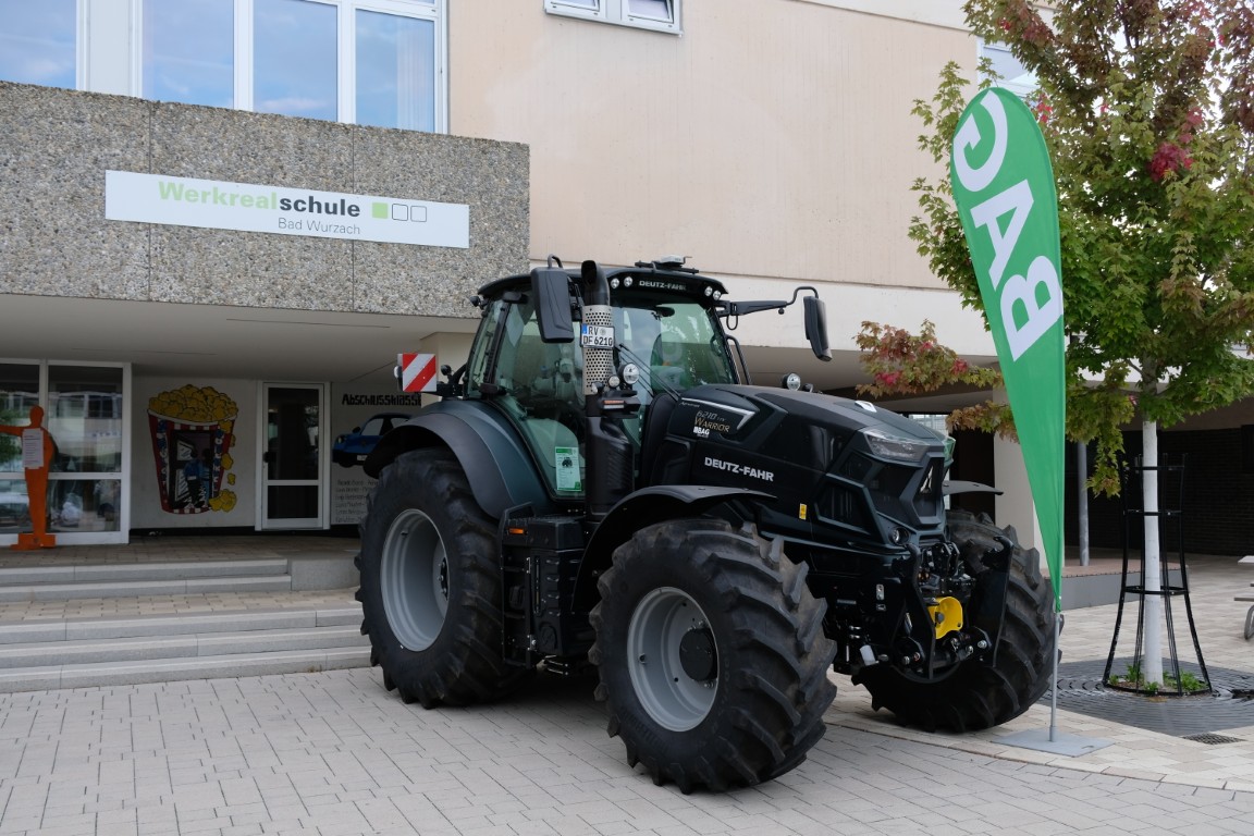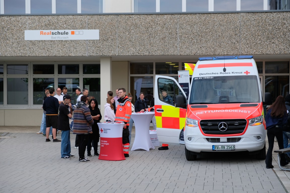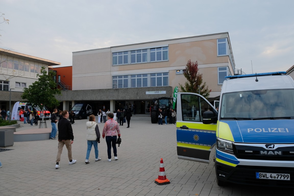 Auf dem Schulhof war wieder das Außengelände der Bildungsmesse: Die Firma Hymer hatte ein Wohnmobil, die BAG einen ihrer großen Deutz-Fahr Traktoren dort platziert. Ebenfalls zeigte das DRK-Rettungswesen des Landkreises Präsenz und machte mit blinkendem Blaulicht an seinem Rettungswagen fleißig auf sich aufmerksam. Das andere Mitglied der Blaulichtfamilie, die Polizei, war ebenfalls mit einem Fahrzeug vertreten, während im SBBZ-Foyer die Beratung über eine Karriere bei den Freunden und Helfern des Polizeipräsidiums Ravensburg stattfand.