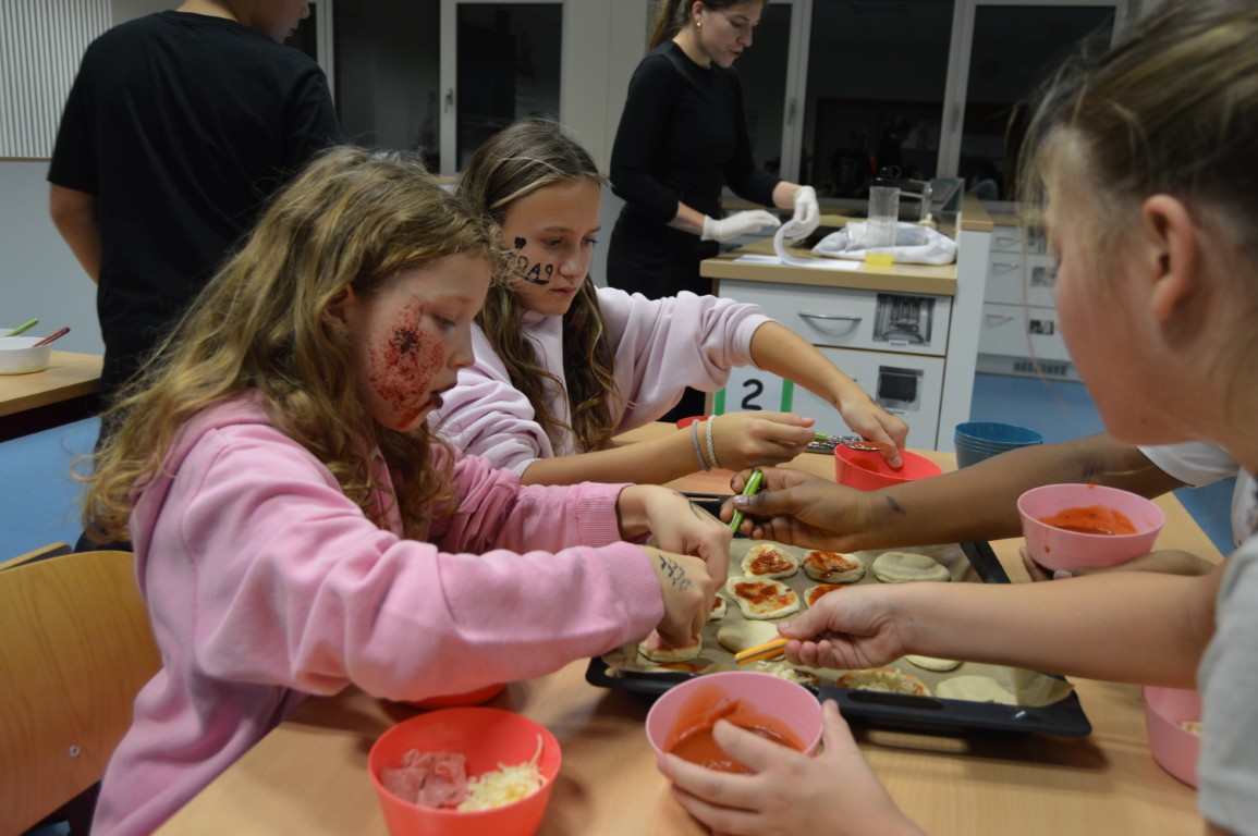 erwartete die Schülergruppe ein buntes Programm: Verstecken im und um das Schulhaus, Gruselpizzen backen mit Frau Jaksch, gemeinsames Essen und Musizieren mit Herrn Butscher.